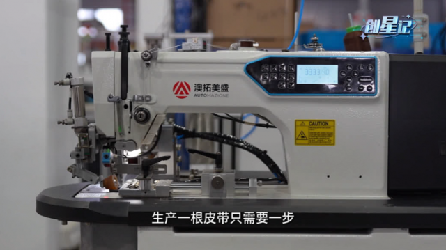 澳拓美盛創始人周建良向我們展示的一臺機器,每天可以自動縫制1000多根皮帶,平均每40秒就能生產1根。