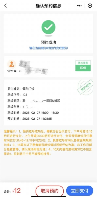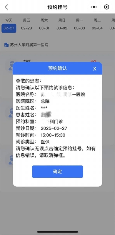 微信/支付寶搜索“蘇州醫保”小程序。點擊“預約掛號”,選擇相應醫院、科室、醫生和就診時間,核對無誤后點擊“確定”,提前預約掛號就完成了。
