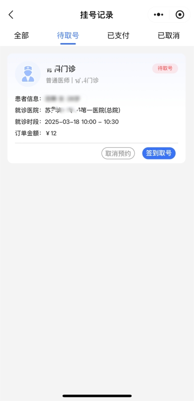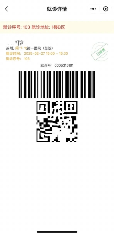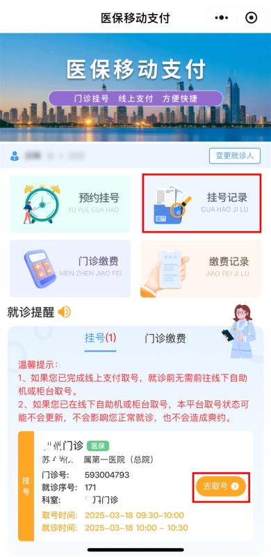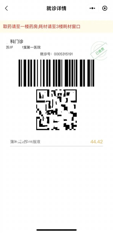 到了就診當天,進入蘇州醫保微信/支付寶小程序,點擊首頁“去取號”,或者在“掛號記錄”中找到已預約的號,去支付,即完成在線取號。我們根據條形碼上方的紅色字體提示,前往相應的診室就診即可。