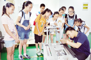 本報訊(記者 徐盛兵 文/圖) 昨天上午,參加美德少年科技夏令營的“美德少年”、“優秀小公民”分為三組,參觀了中科院上海技術物理研究所太倉中心,了解自動化車床裝配過程,并親手裝配機器人。