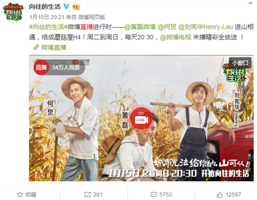 《向往的生活》此次深度綁定微博,主話題閱讀超過17億,討論量132萬,與其“不按套路出牌”的新媒體推廣有很大的關系。節目首播前一周,《向往的生活 | 前傳篇》連續6天通過微博直播進行預熱,每晚20:30進行1小時官微直播,圈定新媒體收視人群,從而擴大節目受眾;直播中官微與網友互動,積累新媒體粉絲的同時做電視端播出預告,為電視收視導流,6場直播,累計91萬次觀看。欄目通過全新的直播互動形式,深度聯動新媒體用戶,這也是首個電視綜藝欄目嘗試電視未播花絮微博直播。