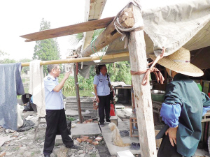 金倉湖派出所結合轄區農民自建房集中翻建的實際情況,組織民警、輔警對村民過渡期居住的簡易棚進行檢查,指導村民規范用電,科學擺放鍋灶、大功率電器等,囑咐村民增設滅火器等設備。