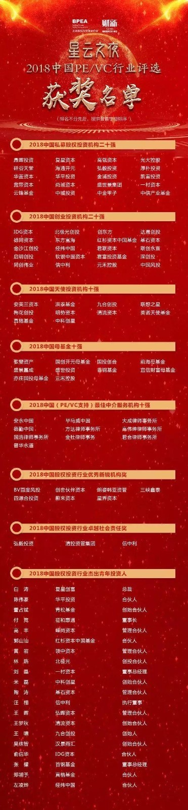 2018年12月8日晚,由中國股權投資基金協會、北京股權投資基金協會、財新傳媒聯合主辦的“星云之夜——2018中國PE/VC行業評選頒獎典禮”在北京香格里拉飯店盛大舉行。一村資本憑借在并購和創投領域的前瞻性投資布局與出色的股權投資業績,榮膺“2018中國私募股權投資機構二十強”,一村資本董事總經理劉晶先生上榜“2018中國股權投資行業杰出青年投資人”。