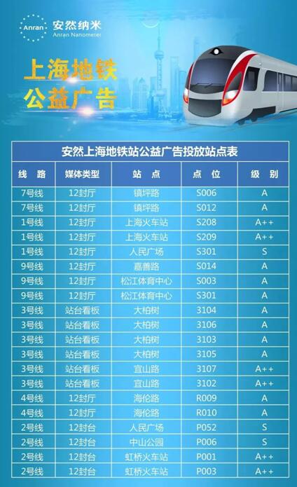 近日,安然公益廣告在上海市各地鐵站點投放。這是繼央視六大頻道和北京站視頻廣告高頻次播出后,安然公司在品牌建設(shè)上的又一重大舉措。2019年1月3日后,安然公益廣告將在上海市各地鐵站全線投放!