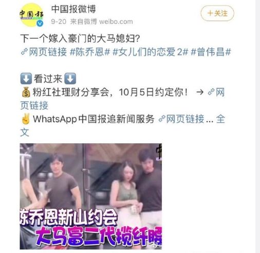 比如9月20日陳喬恩到馬來西亞錄制《女兒們的戀愛》被夸張報(bào)道即將嫁入豪門。