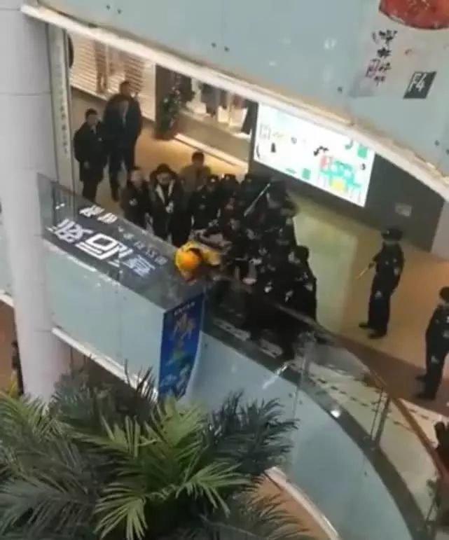 幾段現場視頻顯示,數名商場保安隨后將外賣員制服,期間,外賣員試圖翻越護欄跳樓,被保安制止。