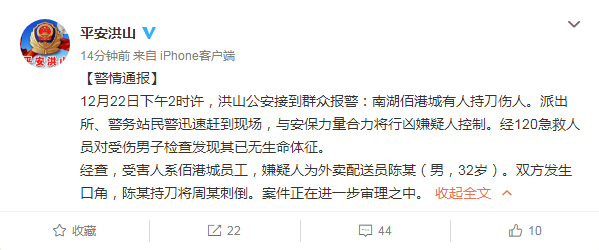 12月22日下午2時許,洪山公安接到群眾報警:南湖佰港城有人持刀傷人。派出所、警務站民警迅速趕到現場,與安保力量合力將行兇嫌疑人控制。經120急救人員對受傷男子檢查發現其已無生命體征。