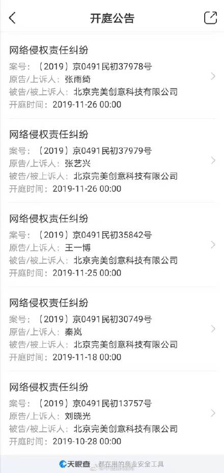 此前,天眼查顯示,互聯(lián)網(wǎng)醫(yī)美平臺更美App所在的北京完美創(chuàng)意科技有限公司近日遭馬蘇、王鷗、劉詩詩、李易峰、張雨綺、張藝興、王一博、秦嵐等多位明星起訴,案由均為網(wǎng)絡(luò)侵權(quán)責(zé)任糾紛。