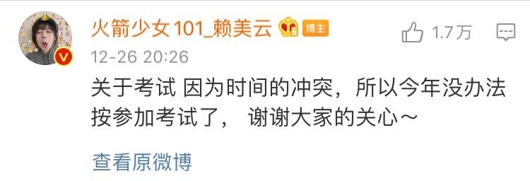 賴美云生于1998年,今年21歲。高中學(xué)歷的她曾透露今年年底要參加藝考,但在近日的微博中,她在評(píng)論區(qū)告訴粉絲:“關(guān)于考試,因?yàn)闀r(shí)間的沖突,所以今年沒(méi)辦法參加考試了,謝謝大家的關(guān)心。”