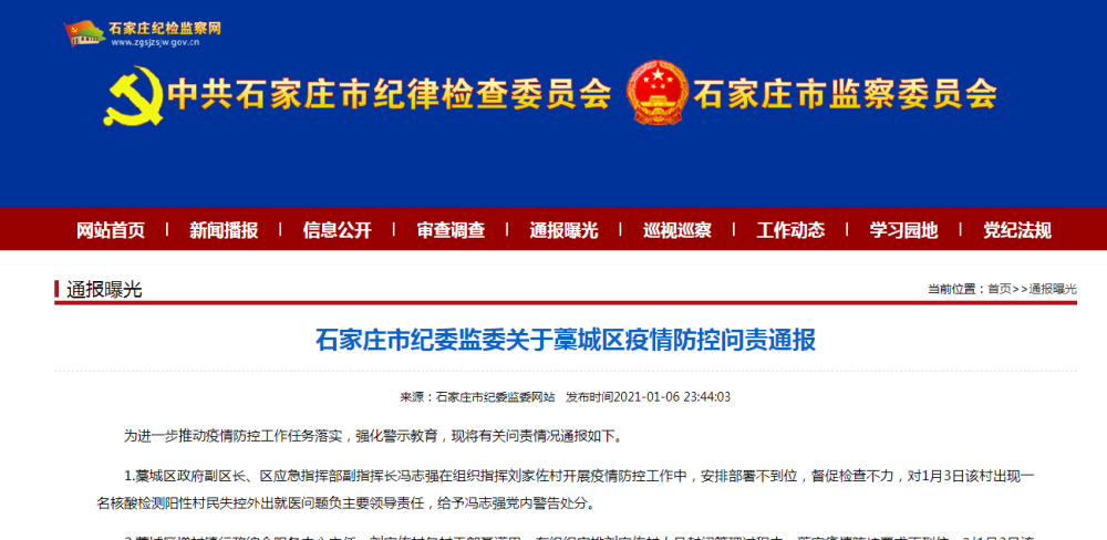 1.藁城區政府副區長、區應急指揮部副指揮長馮志強在組織指揮劉家佐村開展疫情防控工作中,安排部署不到位,督促檢查不力,對1月3日該村出現一名核酸檢測陽性村民失控外出就醫問題負主要領導責任,給予馮志強黨內警告處分。
