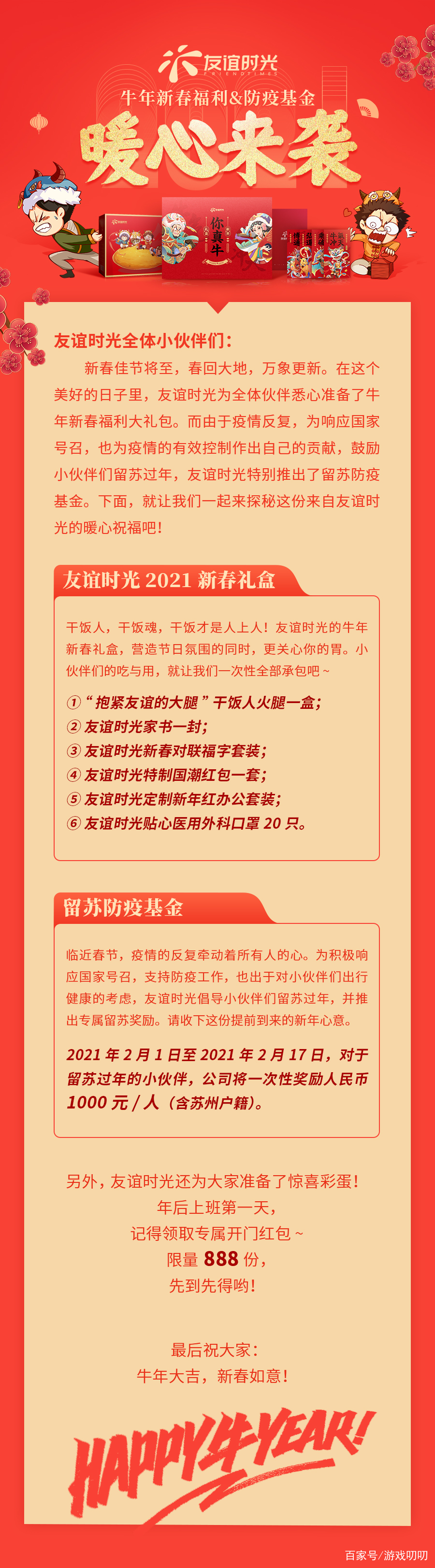 蘇州的游戲企業,有著“女性游戲第一股”的友誼時光在2月2日最新推出了新春福利政策以及本地過年福利:2021年2月1月至2021年2月17日,對于留蘇過年的小伙伴,公司將一次性獎勵人民幣1000元/人(含蘇州戶籍)。另外還面向全體員工補助新年大禮包: