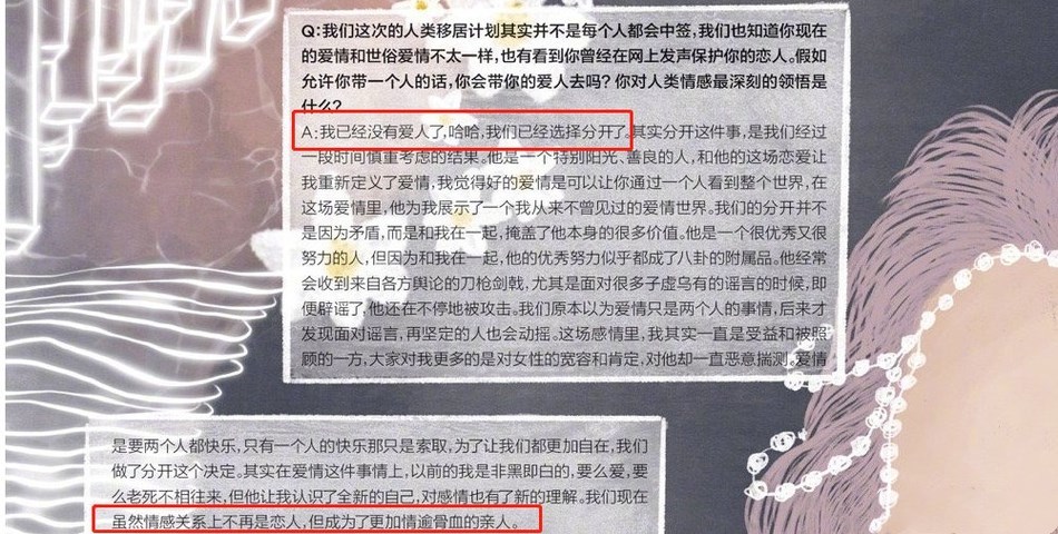 2021年3月4日,李冰冰的最新采訪曝光,她透露已與小16歲的男友分手。李冰冰說:“我們已經選擇分開了,雖然情感關系上不再是戀人,但是成為了更加情逾骨血的親人。”