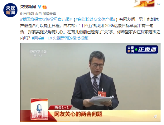 聚焦兩會之聲,白巖松透露:“十四五”規劃和2035遠景目標草案中有一句話,探索實施父母育兒假。在育兒假前已經有了“父”字。