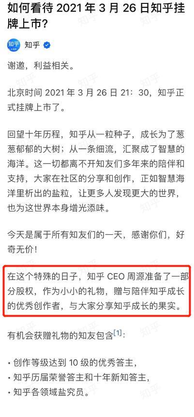 同時,周源稱,將向創作等級達到 10 級的優秀答主等各類知友贈送一部分股權。