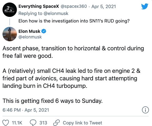 昨日,馬斯克再次在推特上解釋,SN11 的爆炸源于燃料泄漏。