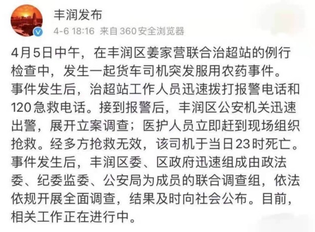 4月5日,河北滄州泊頭市貨車司機金德強途經豐潤區超限檢查站時,因北斗定位掉線,被扣車并罰款2000元。金德強不能接受此等處罰,服農藥自殺,搶救無效死亡。