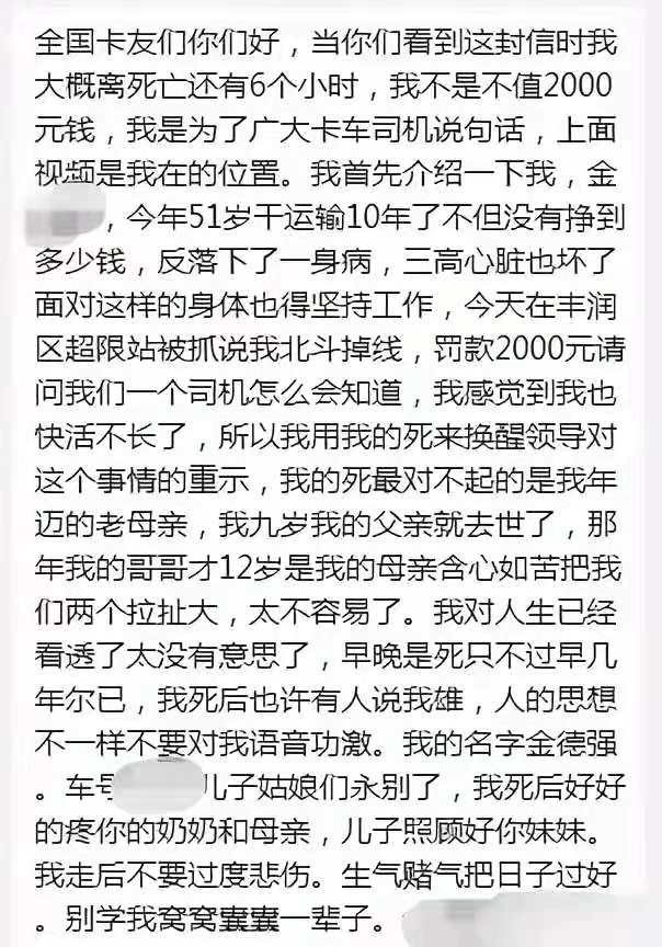 據金德強的哥哥表示,在當天下午3點半左右,金德強在超速檢查站辦公室的走廊里喝下了買回來農藥。隨后他還在一個跑車的交流群里面發布了自己喝農藥的視頻,并稱:“你看我喝了藥,10分鐘了沒有人管沒有人問。”