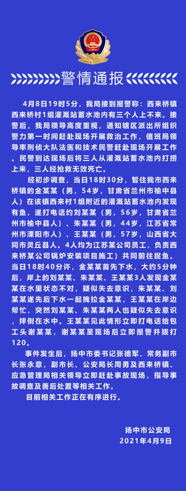 4月9日,江蘇一男子下水摸魚時(shí)突然失去意識,兩名同伴發(fā)現(xiàn)不對后下水拉拽,結(jié)果也失去意識,3人均不幸身亡,現(xiàn)場畫面曝光令人揪心。  4月9日,江蘇揚(yáng)中市公安局發(fā)布通報(bào)介紹,4月8