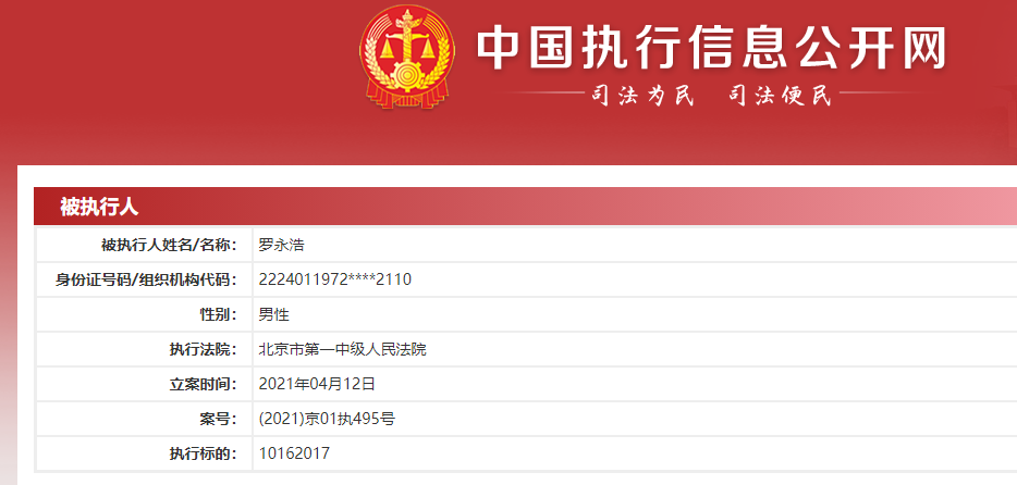 據中國執行信息網顯示,羅永浩于4月12日被法院強制執行,執行法院為北京市第一中級人民法院,案號為(2021)京01執495號,執行標的約為1016萬元。