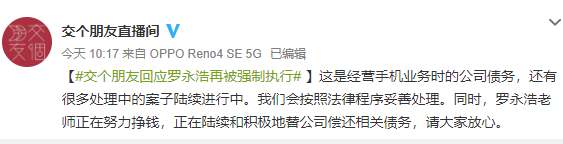 14日上午,交個朋友直播間微博就“羅永浩再被強制執行”一事回應稱,這是經營手機業務時的公司債務,還有很多處理中的案子陸續進行中。會按照法律程序妥善處理。