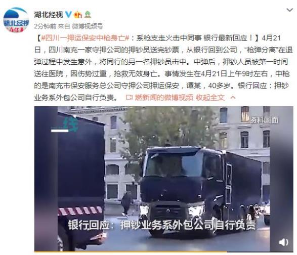4月21日,四川南充一家守押公司的押鈔員送完鈔票,從銀行回到公司,“槍彈分離”在退彈過程中發生意外,將同行的另一名押鈔員擊中。中彈后,押鈔人員被第一時間送往醫院,因傷勢過重,搶救無效身亡。事情發生在4月21日上午9時左右,中槍的是南充市保安服務總公司守押公司押運保安,譚某,40多歲。銀行回應:押鈔業務系外包公司自行負責。