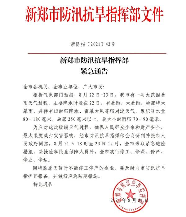 8月21日,新鄭市防汛抗旱指揮部發布緊急通告。
