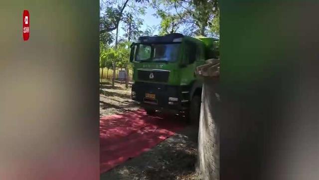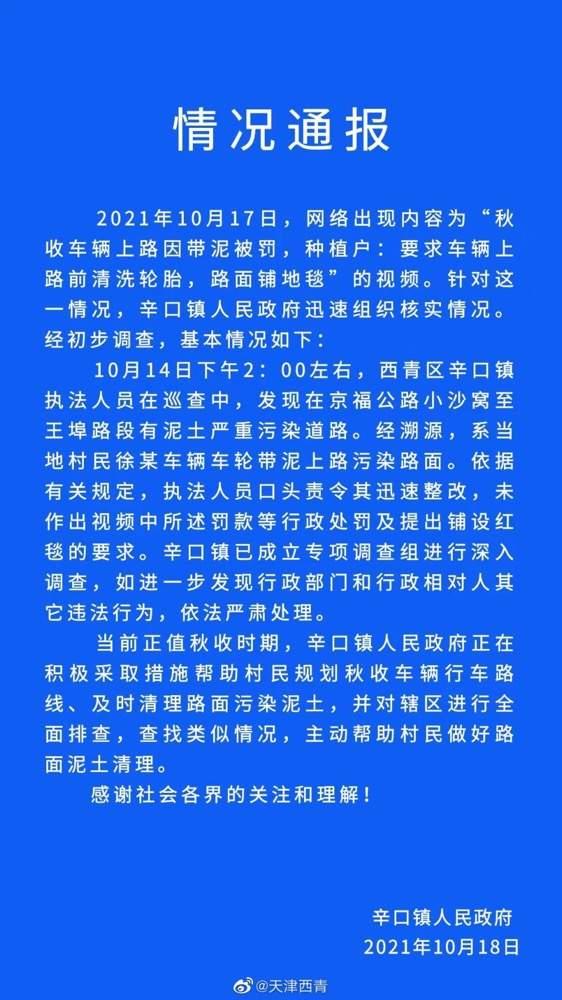 10月15日,網曝天津市辛口鎮城管要求秋收作業車,從地里上路前需要清洗輪胎,并在路面鋪地毯。