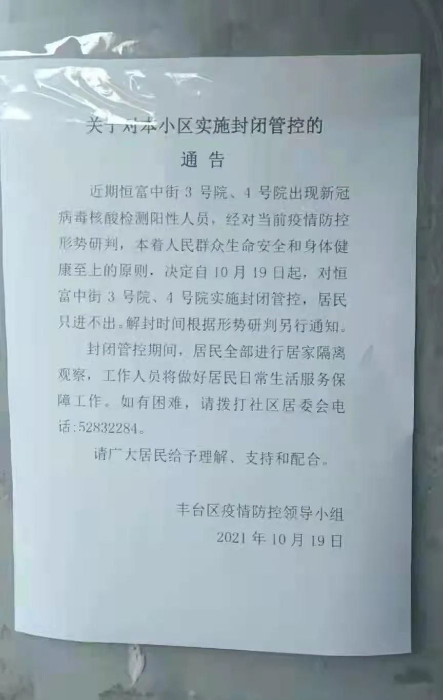 今日(10月19日)網傳“北京豐臺區恒富中街3號院、4號院現陽性病例,已封閉管理。”據一張落款為豐臺區疫情防控領導小組的通告圖片顯示,近期位于北京市豐臺區恒富中街3、4號院出現新冠病毒核酸檢測陽性人員,決定自10月19日起,對恒富中街3號院、4號院實施封閉管控,居民只進不出。