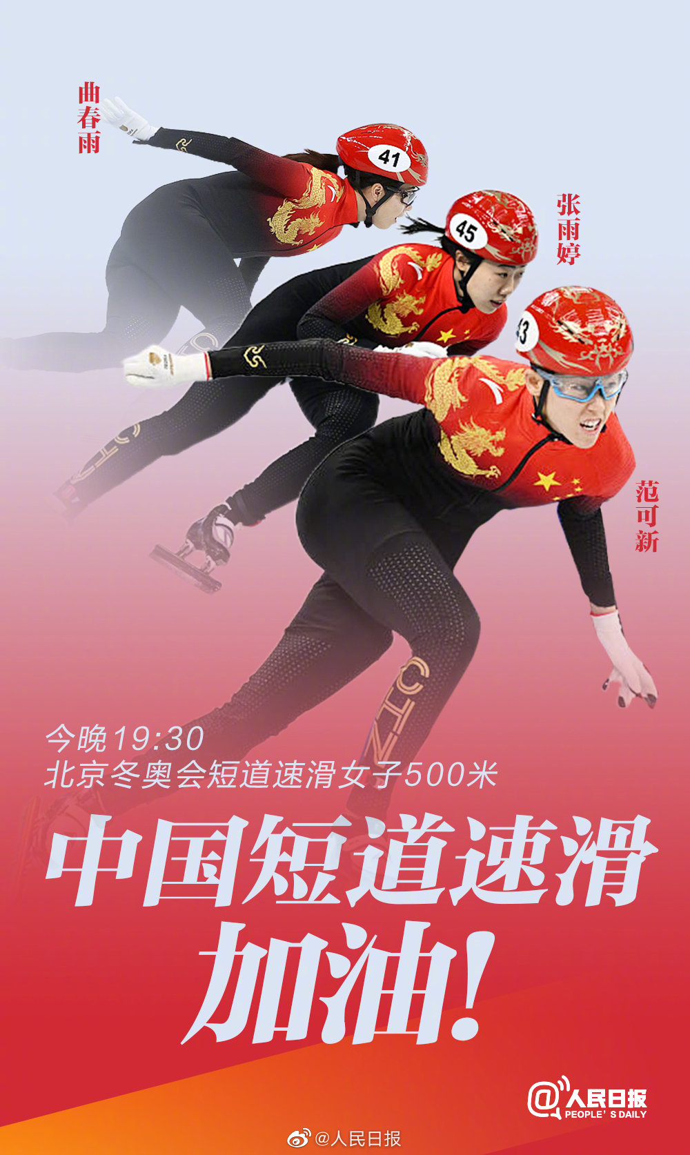 【范可新張雨婷曲春雨沖擊獎牌】今晚,北京冬奧會短道速滑女子500米項目,將進行1/4決賽、半決賽、決賽,@范可新FKX @曲春雨_cc @張雨婷vz 出戰!一起傳遞,#一人一句為中國短道速滑加油#,#中國短道速滑隊再沖金#,期待精彩表現! ?