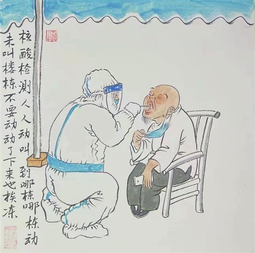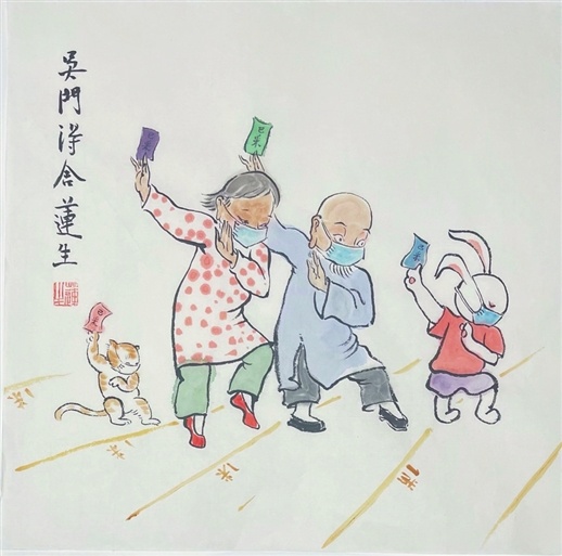 核酸檢測做了一輪又一輪,畫面中一貓一兔終于集齊了四色核酸檢測憑證,他們高舉憑證正歡快起舞,地面上的一米間隔線也分外顯眼。郁生宏說:“這張畫的靈感來源于一次核酸檢測時看到拿到核酸檢測憑證開心蹦跶的少年,我的女兒因為屬兔,便以兔子的形象在畫中呈現(xiàn)。”郁生宏還將疫情防控中的重要元素融入作品中,其中“真人不露相”“一隔胖三斤”“不信謠不傳謠”等作品廣受好評,而“有一種幸福叫生活在蘇州”“沒有一個冬天不會過去,沒有一個春天不會到來”等作品則體現(xiàn)出他對蘇州疫情早日結(jié)束的美好期許。