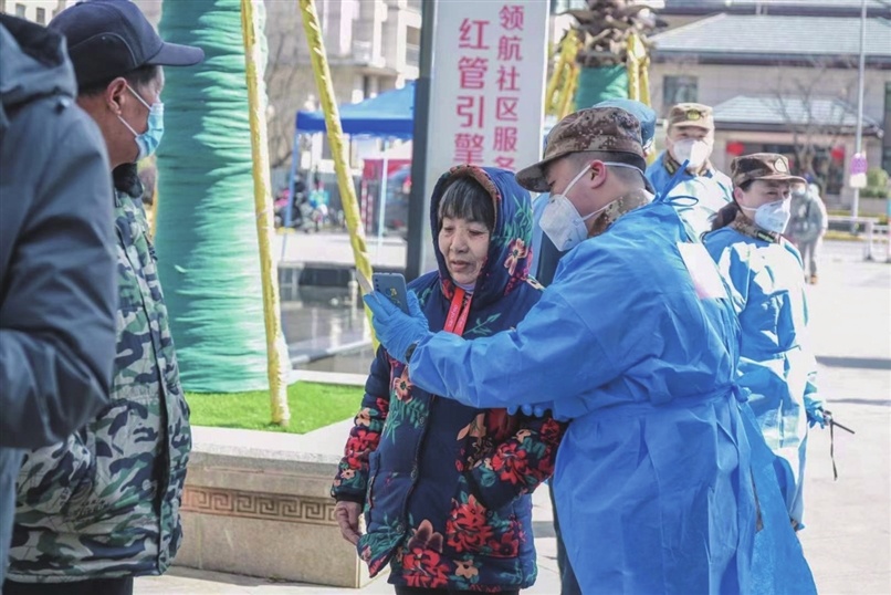年輕的姚海龍手持測溫槍,給排隊(duì)的居民測體溫。他曾是一名大學(xué)生士兵,在火箭軍某部服役,參加過中華人民共和國成立70周年閱兵式。收到招募志愿者通知后,他第一時(shí)間聯(lián)系轄區(qū)人武部報(bào)名。搬運(yùn)物資、測溫、督查掃碼,這兩天姚海龍每天工作都在8個(gè)小時(shí)以上,對(duì)此他毫無怨言。“中國軍人就是要召之即來,來之能戰(zhàn),戰(zhàn)則必勝。我雖然脫下了軍裝,但軍人本色不能變。”