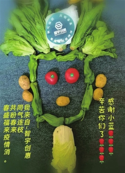 4月24日,540份新鮮蔬菜禮包在蘇大北小區門外“集結”。這些蔬菜禮包,來自街道轄區內的愛心企業智宇創惠。該企業的員工組成志愿者隊伍,由負責人帶隊,分7輛車將蔬菜禮包送到小區門口,再由防疫突擊隊成員“投喂”給居民。記者看到,禮包里有生菜、油麥菜、土豆、番茄,還有青椒、大白菜,品類豐富,而且非常新鮮。收到愛心企業的蔬菜禮包后,居民們以蔬菜為原型即興創作人像拼貼畫,并發到小區微信群,向愛心人士和守護小區的“大白”“大藍”表達感謝。