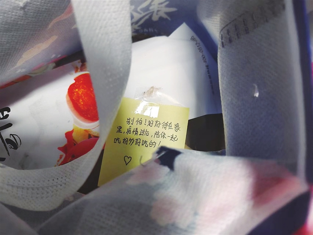 居家的第3天,志愿者幫忙送來了一份外賣,是一份鮑魚扣海參撈飯。打開后里面有一張手寫的紙條:“別怕!好好待在家里,疫情過后,陪你一起吃好多好吃的!”署名是她讀初中時期的好友。王蘭欣把這張紙條反復(fù)看了好多遍,她覺得,信上的每一個字都很溫暖。