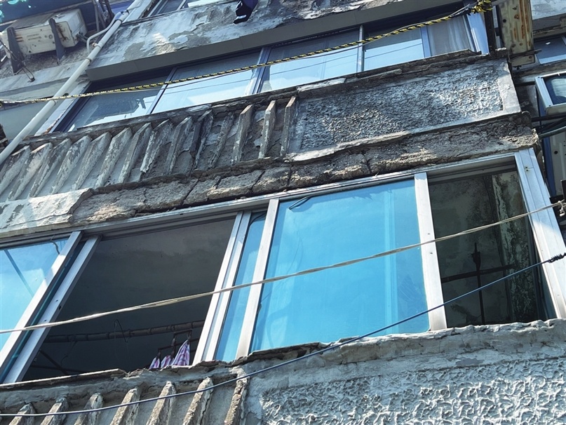 昨天,一位小區物業人員到現場拍攝了視頻。該工作人員稱,物業打算先消除隱患,將外墻上有可能出現脫落的地方處理干凈,目前還在同相關業主溝通。至于修繕,他表示,因小區沒有公共維修資金,按照規定,樓體公共部位的維修費用應由業主共同承擔,但在實際操作上有難度。