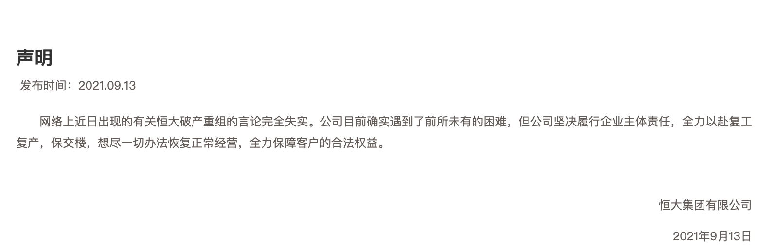 日前,恒大集團發表聲明稱,網絡上近日出現的有關恒大破產重組的言論完全失實。