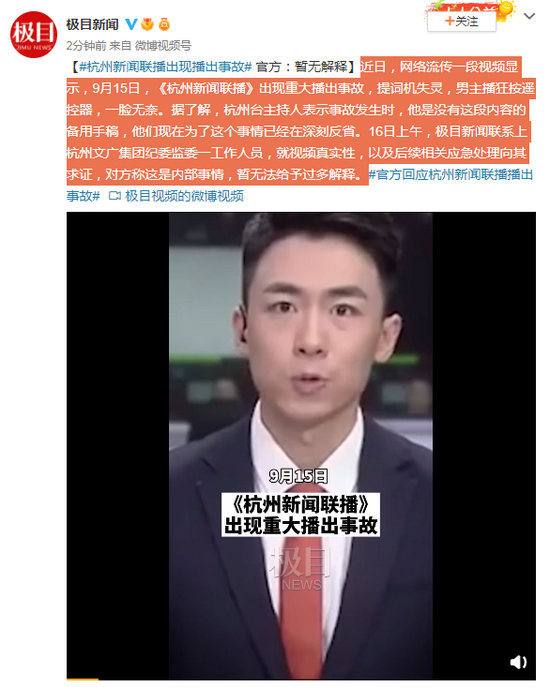 近日,網絡流傳一段視頻顯示,9月15日,《杭州新聞聯播》出現重大播出事故,提詞機失靈,男主播狂按遙控器,一臉無奈。據了解,杭州臺主持人表示事故發生時,他是沒有這段內容的備用手稿,他們現在為了這個事情已經在深刻反省。